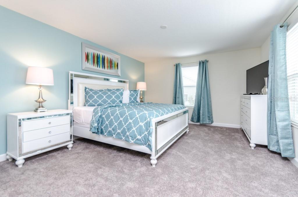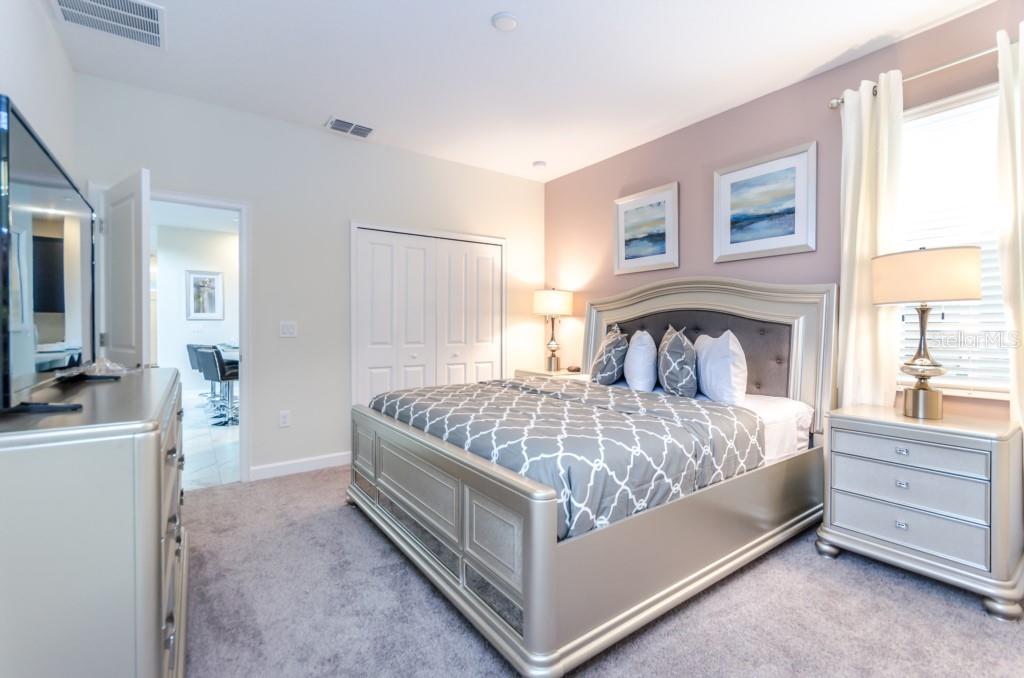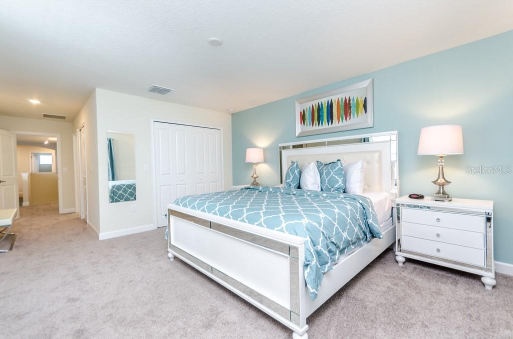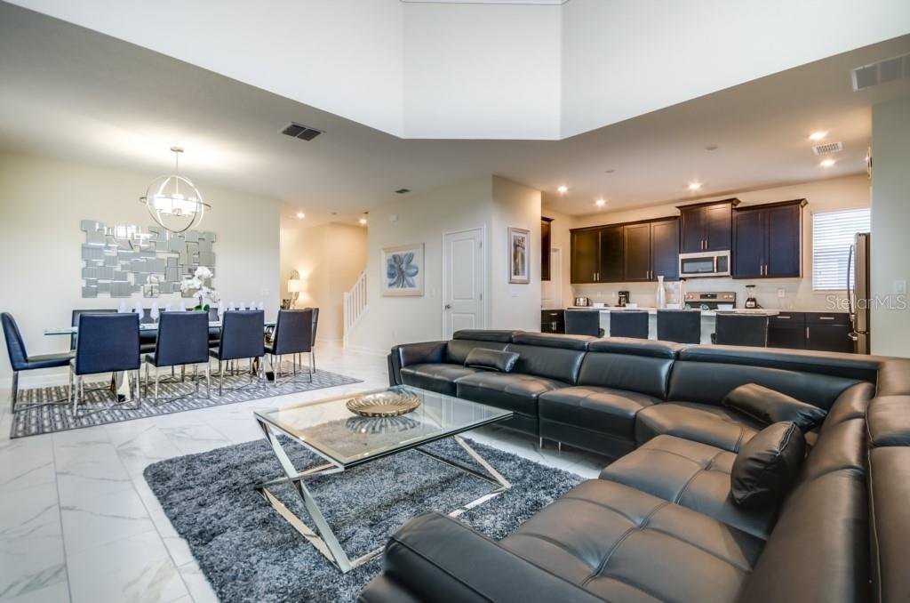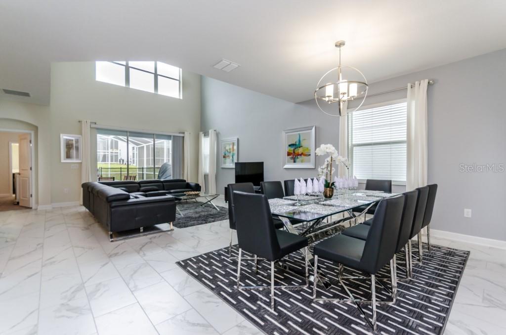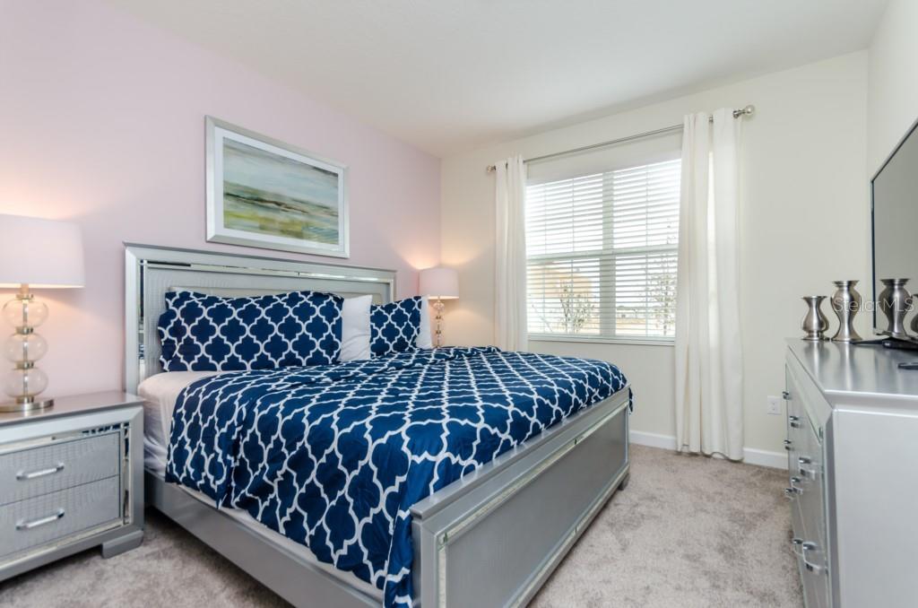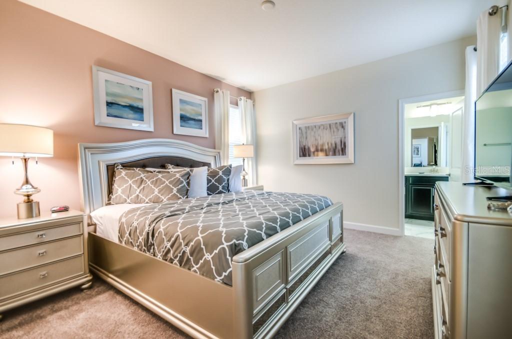 Welcome to this luxurious vacation home in Championsgate! Two spacious master bedrooms, a bonus room, and a game room . The beautiful kitchen features 42″ cabinets, stainless steel appliances, and Quartz countertops. Step outside to a covered patio and screened pool and spa.